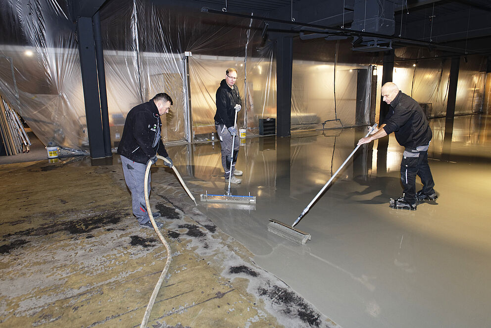 Les travaux de construction ont débuté en 2020. La première étape a été de rénover le sol. En effet, le support en asphalte coulé avait déjà été réparé plusieurs fois par le passé et ne pouvait donc pas être facilement utilisé comme support pour un nouveau revêtement de sol. Pour créer une surface lisse, il doit être complètement enduit.