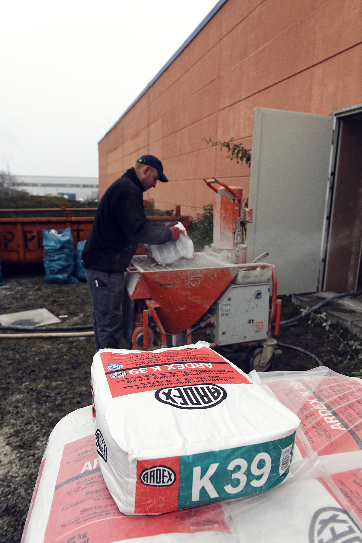 L’enduit est généralement mélangé et appliqué dans un seau. Cela prend cependant beaucoup de temps pour des surfaces d’environ 400 mètres carrés. « Nous connaissons bien l’objet et avons conseillé le propriétaire et le constructeur », déclare Ewald Wischler du grossiste spécialisé Mega. « Le travail peut être considérablement facilité si l’enduit est appliqué à la pompe. » De grandes surfaces peuvent être enduites rapidement et en continu. L’enduit de ragréage réactivable à base de ciment ARDEX K 39 se prête parfaitement à cette fin. Avec le chef d’équipe d’Ardex, Christian Schmelzer, la procédure a été discutée et son déroulement pratique a été déterminé. Il a ainsi suffi de quelques artisans pour se charger des grandes surfaces. « L’enduit est rapidement arrivé sur son lieu d’utilisation. Et en seulement deux heures, la zone respective était complètement enduite », déclare l’expert d’Ardex.