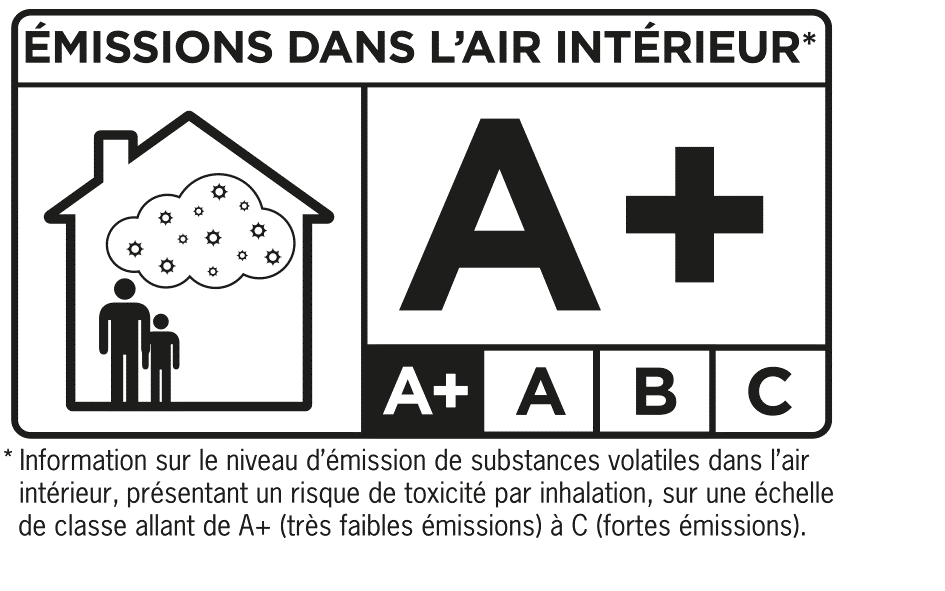 La classification française des COV classe les produits de construction qui sont traités en permanence à l'intérieur en fonction de leurs émissions dans les classes d'émission A+, A, B ou C, où A+ représente la meilleure classe d'émission et C la pire. Ces produits de construction doivent être labellisés en France depuis 2012.