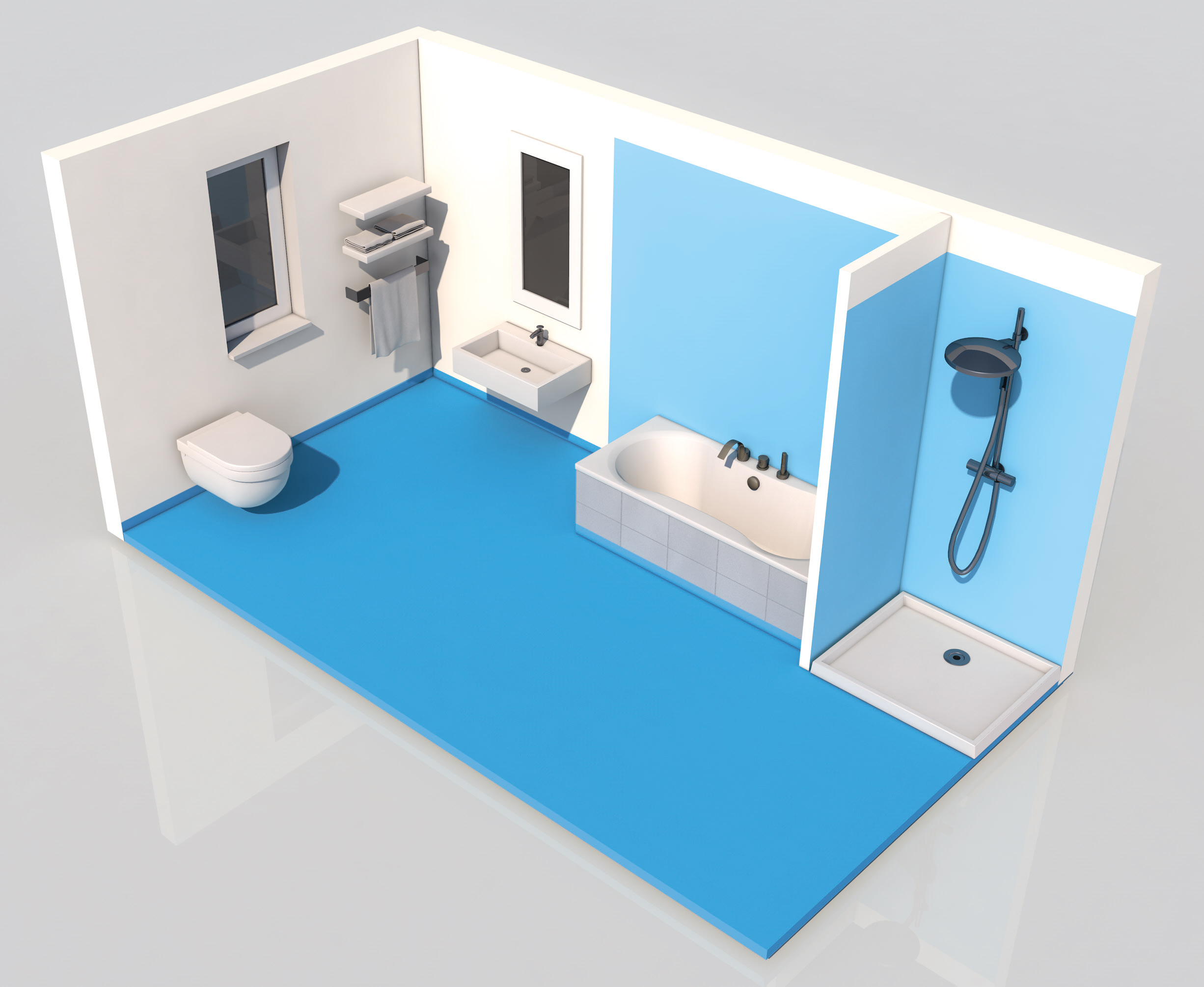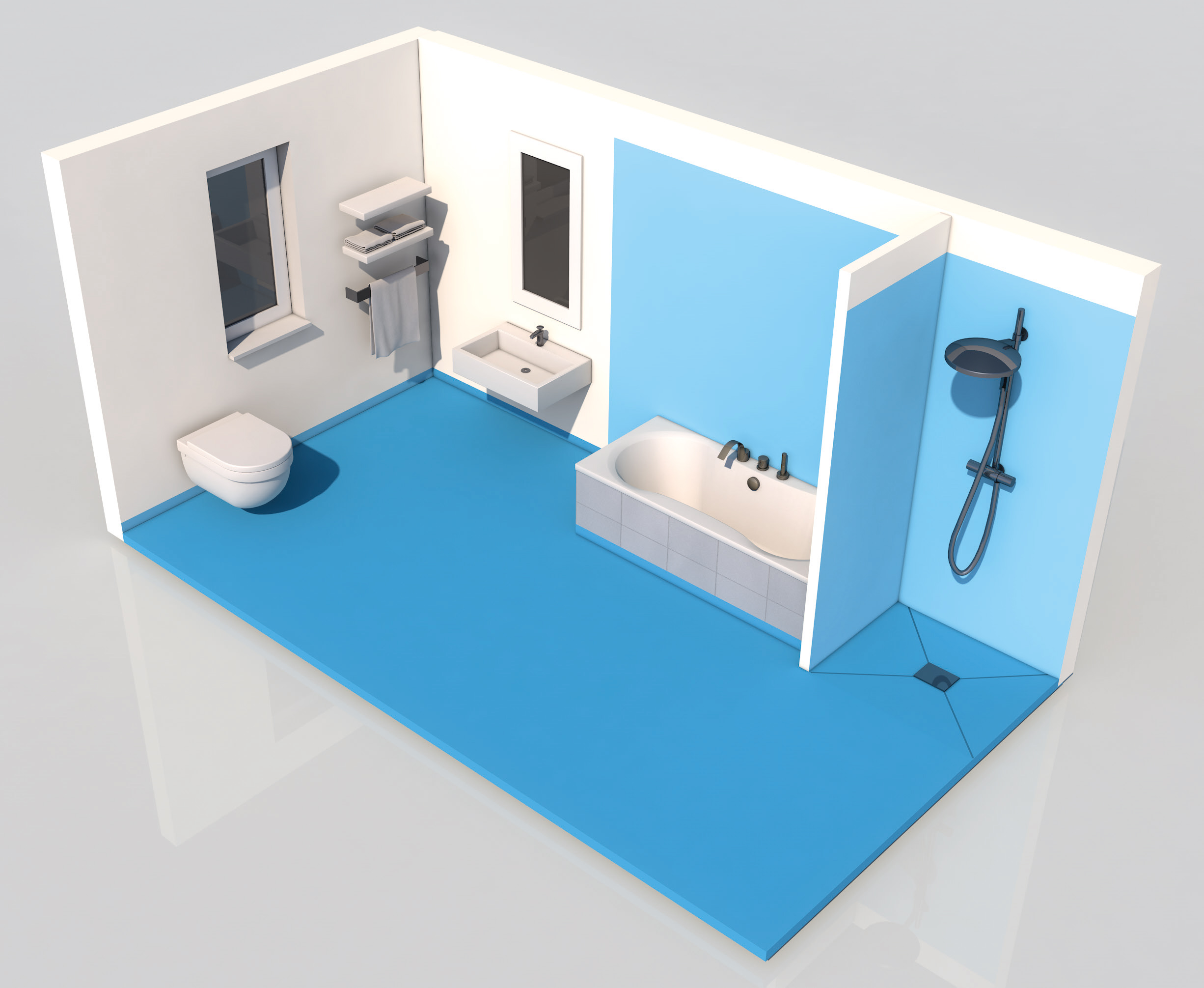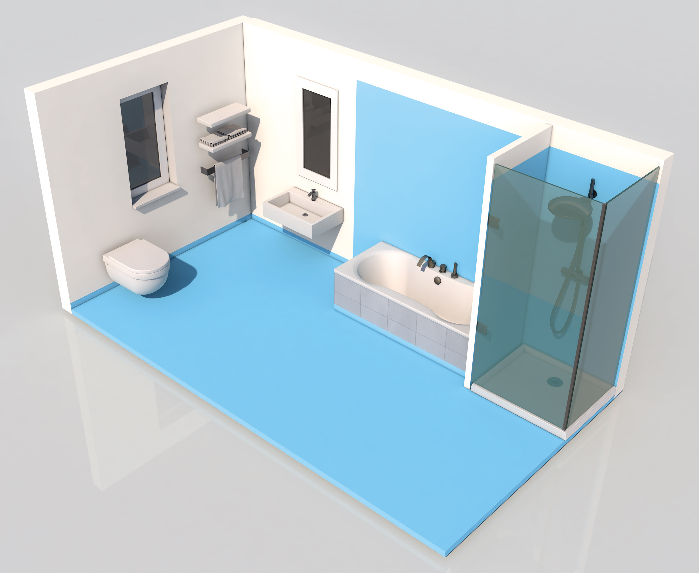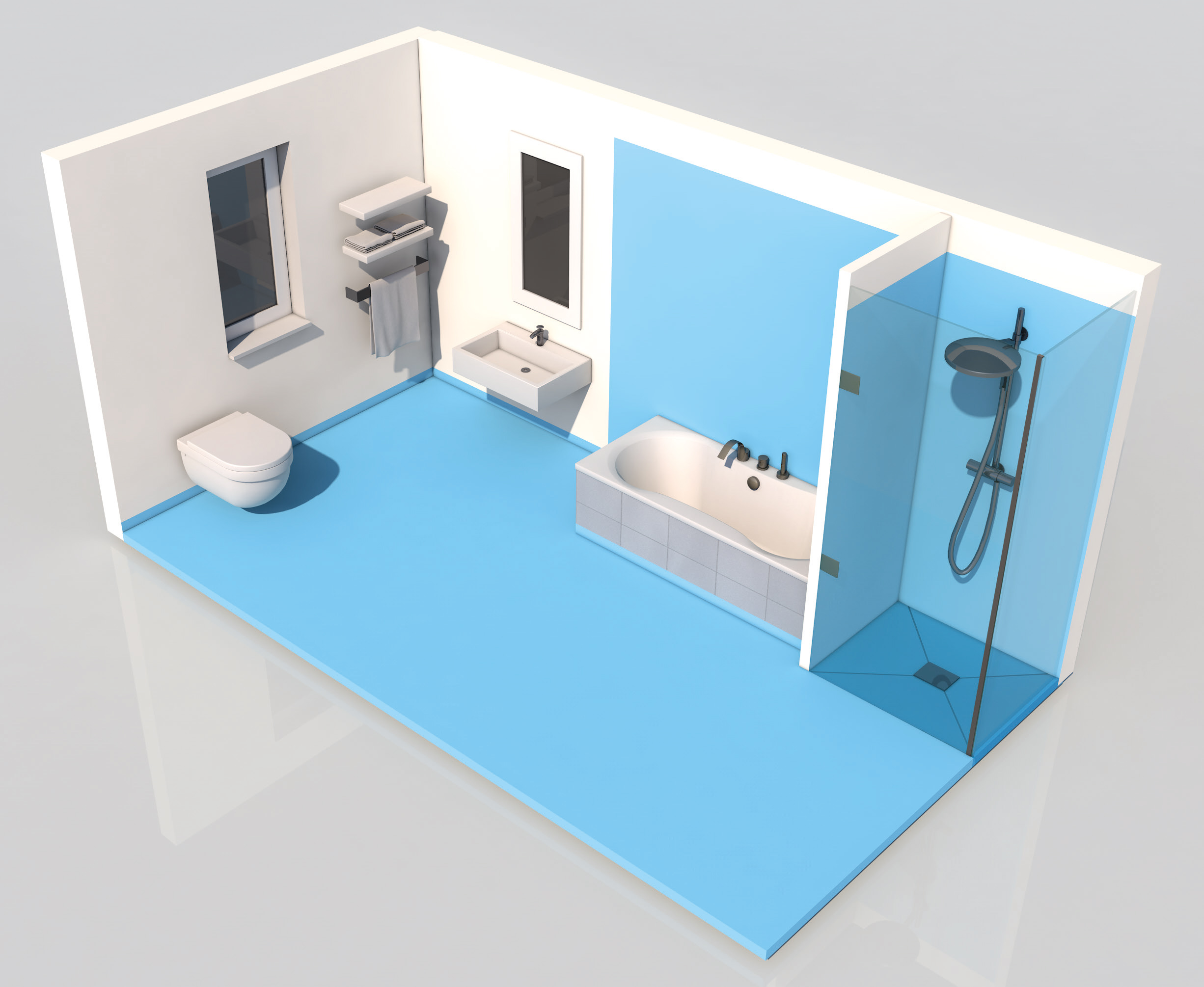 Une fois les baignoires et/ou receveurs de douche installés, il est difficile d’accéder aux zones qui se trouvent derrière ou dessous. Par conséquent, il est nécessaire de protéger ces zones contre l’influence de l’eau. En l’occurrence, un joint silicone n’est pas considéré comme une étanchéité. Selon la norme DIN 18534, il convient de réaliser l’étanchéité de ces zones de la manière suivante :