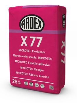 Le mortier-colle souple ARDEX MICROTEC X 77 permet de coller des carreaux en faïence, grès cérame et grès cérame fin, des dalles en béton de taille et en pierre de taille naturelle, à l’intérieur et à l’extérieur. La technologie ARDEX MICROTEC est la garantie d’une exécution en toute sécurité en conditions réelles de chantier. La contrainte au cisaillement est compensée, la résistance d’adhésion est améliorée et la résistance de déformation est réduite. Comparé aux produits conventionnels, ARDEX X 77 se caractérise de plus par une stabilité deux fois plus grande ainsi que par un temps d’application deux fois plus long. Grâce à des additifs spéciaux, ARDEX X 77 est sans efflorescences et présente également d’excellentes propriétés d’application ; par ailleurs, il se caractérise par son grand rendement. Mélangé avec l’amélioration à base de résines synthétiques ARDEX E 90, il est possible d’obtenir un mortier-colle S2 hydrofuge et très déformable.