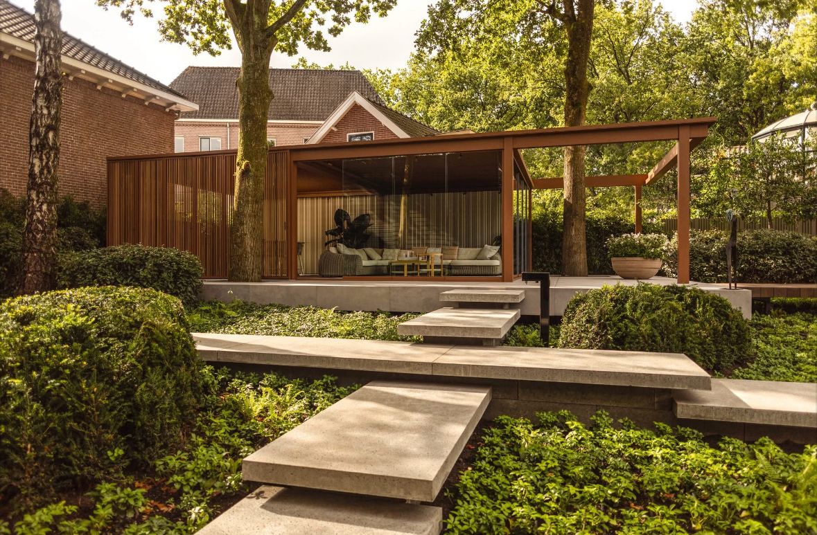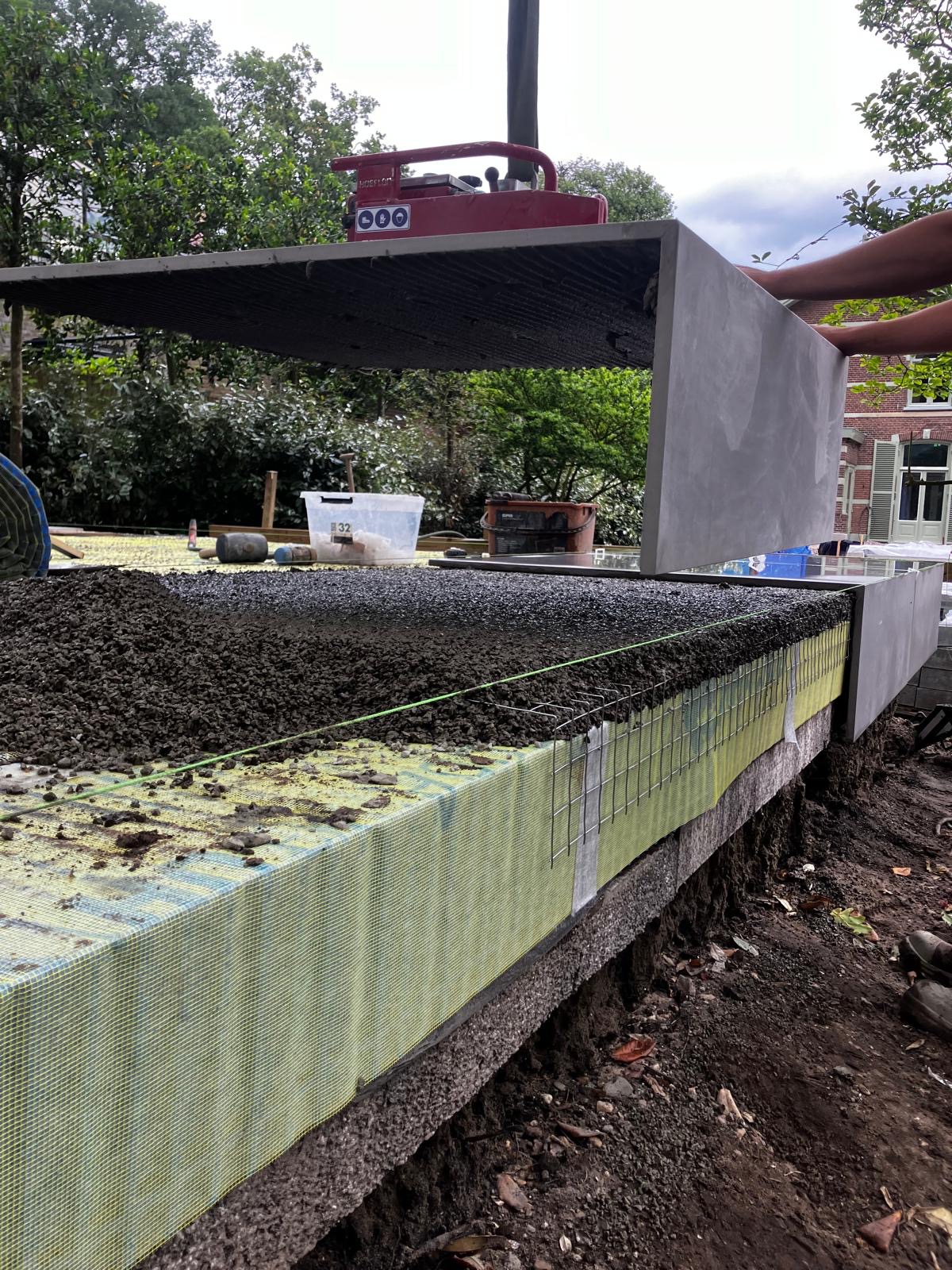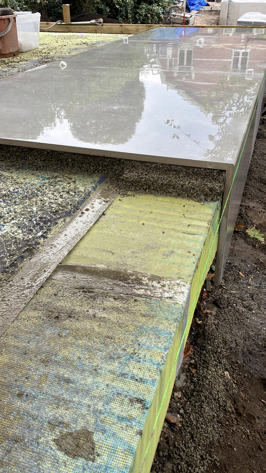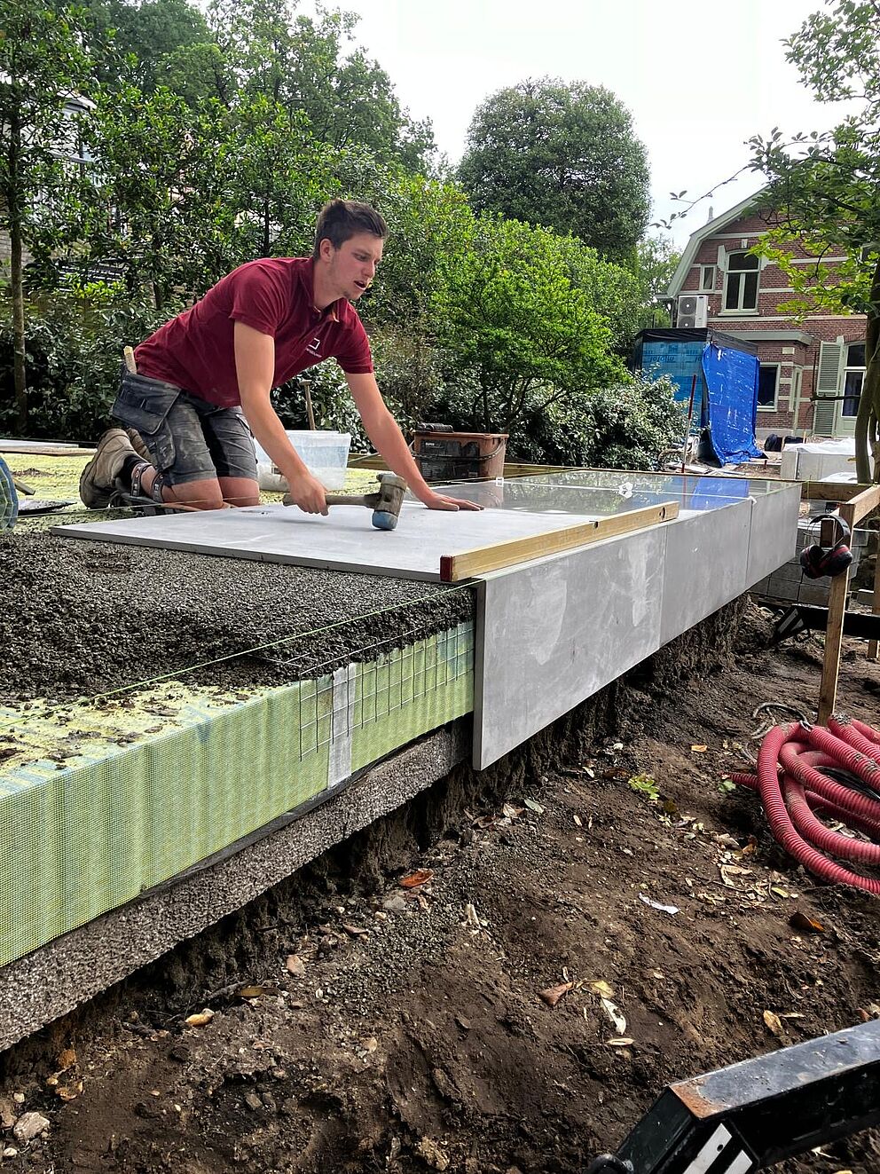 In dit project bij Villa Arte te Laren, moesten er 1200*1200*20 keramische tegels aangebracht worden op een terras met als basis een in het werk gestorte betonnen plaat op afschot. De keramische tegels moesten aan de buitenzijde ook verticaal en in verstek omgezet worden om er een soort van zwevend terras van te maken. Groot formaat tegels is vaak een uitdaging op harde (betonnen) terrassen omdat er niet goed nagedacht wordt over het afvoeren van lekwater wat onder de tegels komt. Vaak zie je na verloop van tijd dan vrijekalk uitboeiingen in de voegen maar nog vaker losliggende tegels of gescheurde tegels. Dit heeft 9 van de 10 keer te maken met het lekwater wat onder de tegels terecht komt en wat dus als het ware opgesloten wordt waardoor thermische spanningen ontstaan en door vorst of nog erger door opwarming in het voorjaar veroorzaakt wordt. In dit project heeft De Terrasbouwer (Gert Jan van den Berg) deze terrassen volledig in een Gutjahr drainage-systeem aangebracht. Op het oppervlak is de 16 mm hoge Gutjahr AquaDrain HU-EK gebruikt en de buitenzijdes zijn voorzien van het trapdrainage element de Gutjahr AquaDrain SD. Hierop heeft Gert Jan dan minimaal 50 mm Romfix drainage mortel op aangebracht om daarna de keramische tegels direct in de nog natte Romfix drainagemortel te kloppen door de onderzijde van de tegels te voorzien van een lijmril van ARDEX X90.