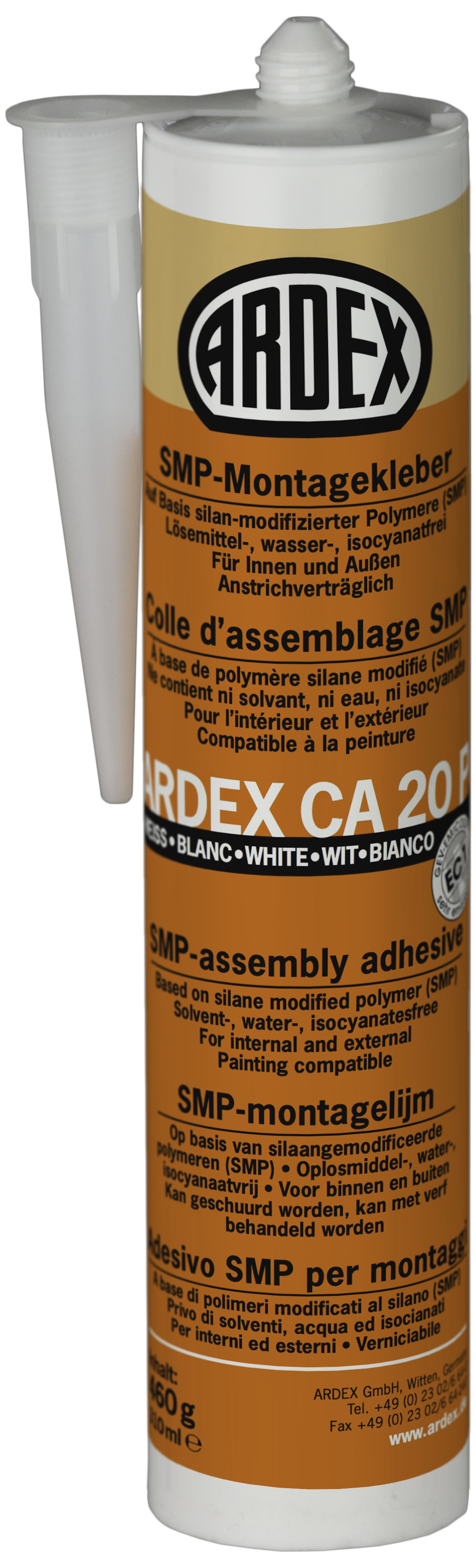 ARDEX CA 20 P is een eencomponent, oplosmiddelvrije en watervrije montagelijm met zeer hoge kleefkracht. ARDEX CA 20 P kan binnen en buiten toegepast worden. De lijm verhardt krimpvrij met een elastische en trillingsongevoelige lijmvoeg. Voor het verlijmen van profielen, plinten, contactstrips, kabelgoten, isolatieplaten, houten en kunststof materialen, metaalprofielen, parketelementen, keramische tegels en vele andere materialen op zuigende en dichte ondergronden. Voor het afdichten van vloer- en aansluitvoegen bij metaal, hout, keramiek en kunststoffen. ARDEX CA 20 P is neutraal uithardend, reukloos, vrijwel krimpvrij en bevat geen oplosmiddelen, siliconen en isocyanaten.