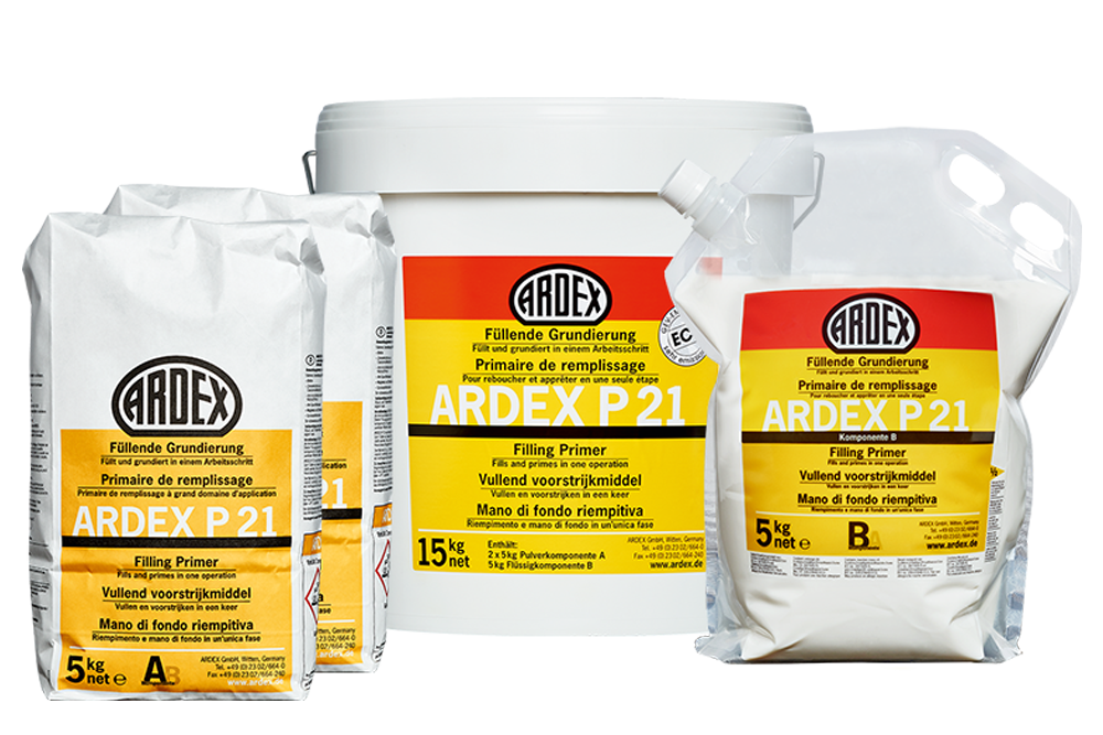 | ARDEX P 21 - Set | 32075 | 4024705320757 | 15 kg im Anmischeimer mit: 2 x 5 kgKomponente A (Pulver) im Papierbeutel 1 x 5 kg Komponente B (Dispersion) im ARDEX REDUXPack | 24 Eimer / Palette |